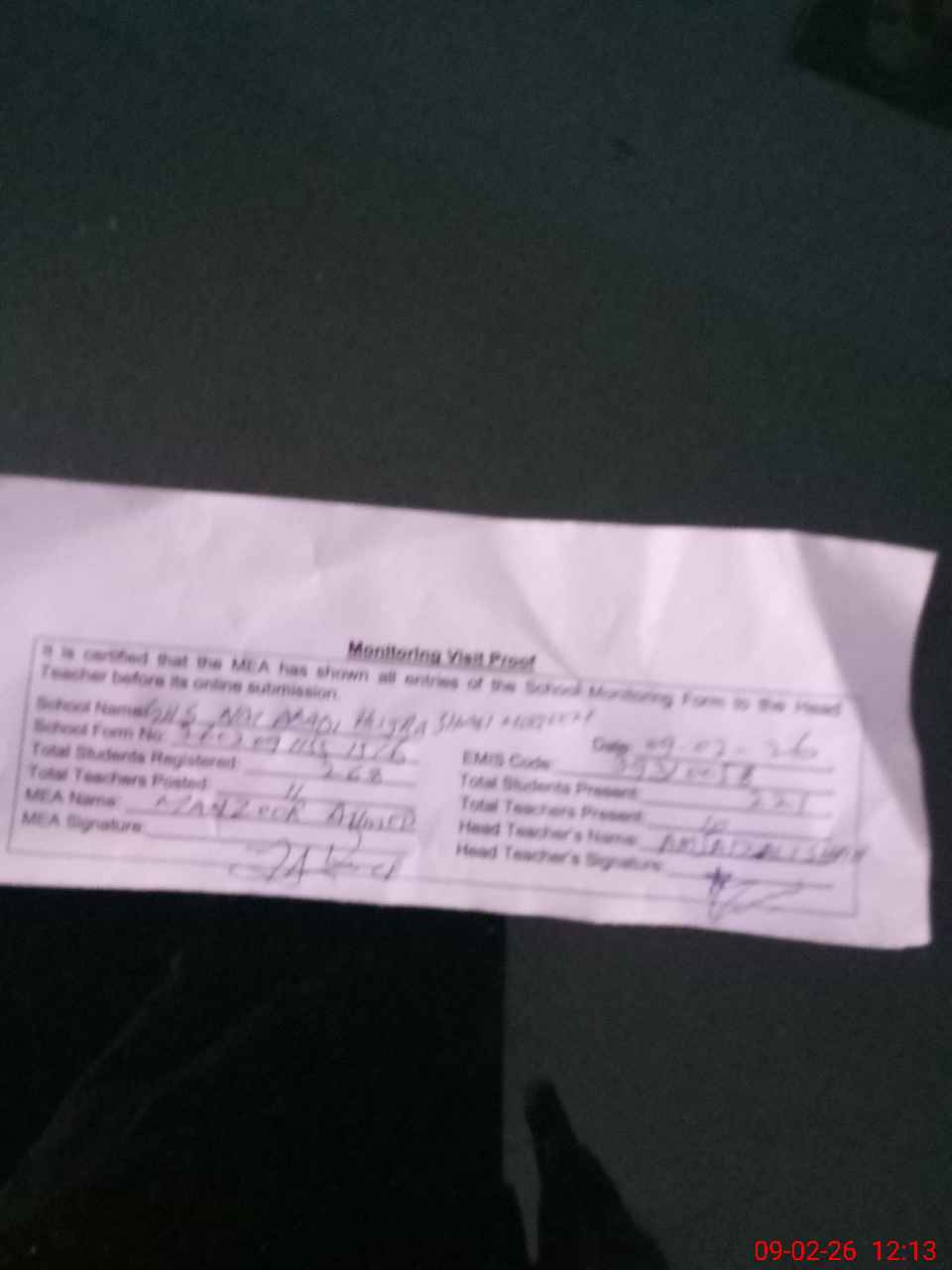 | Attendance Register | Head Teacher | MEA with School | Visit Proof |