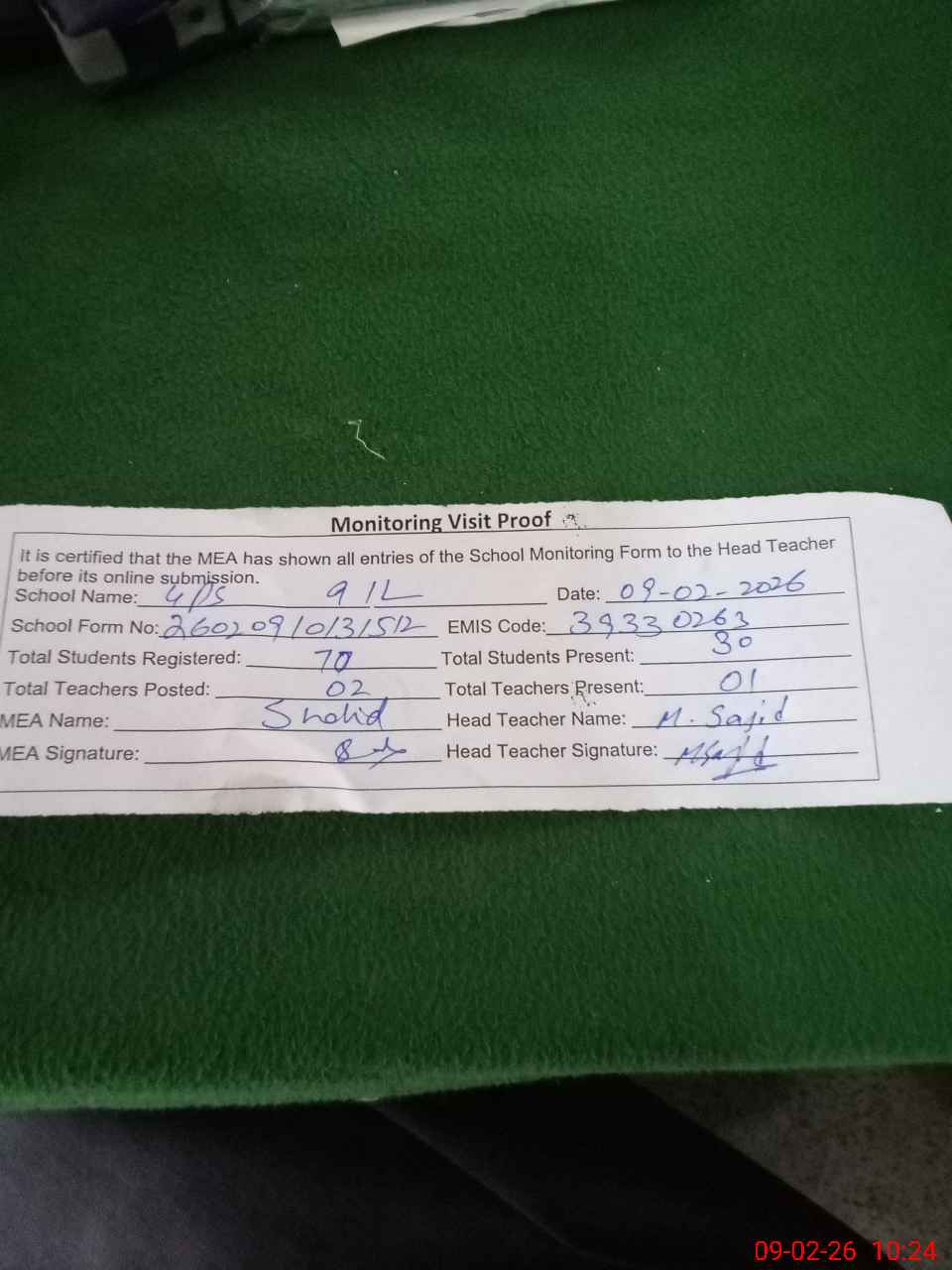 | Monitoring Date: 09-02-2026 | Start Time: 09-02-2026 10:10 AM | End Time: 09-02-2026 10:24 AM | Name of MEA: SH**** YO**** | |