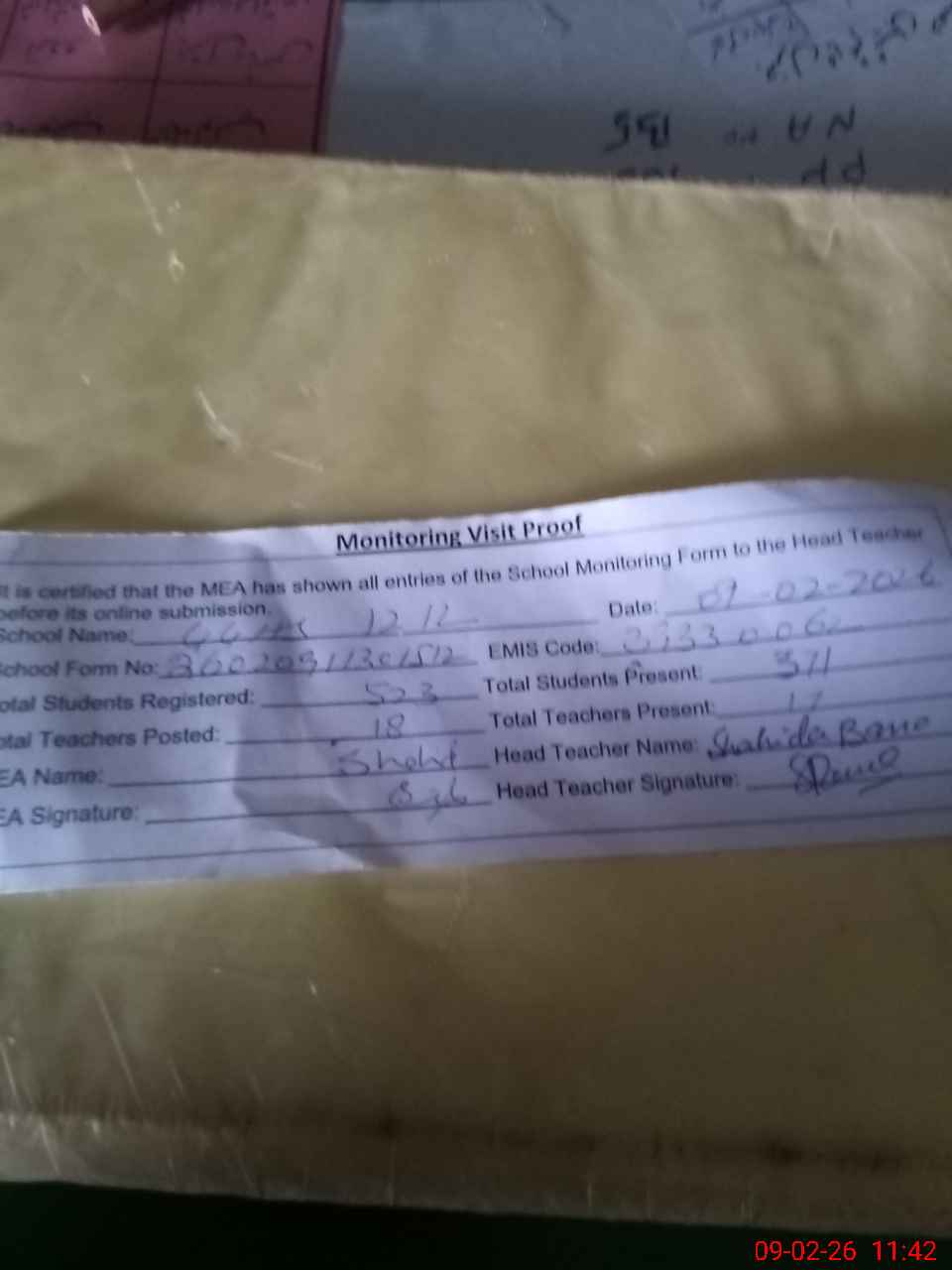 | Attendance Register | Head Teacher | MEA with School | Visit Proof |