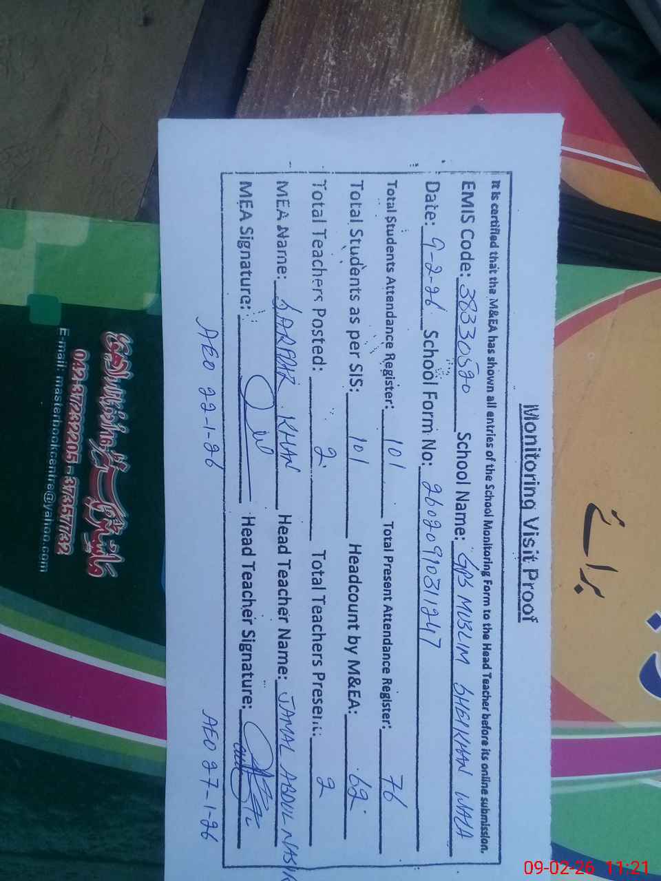 | Attendance Register | Head Teacher | MEA with School | Visit Proof |