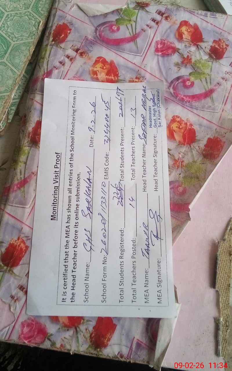 | EMIS Code: 37440045 | Name of School: GHS SAR KALAN | |||