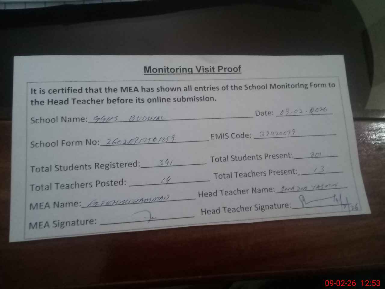 | Attendance Register | Head Teacher | MEA with School | Visit Proof |