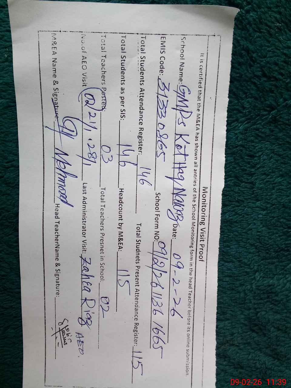 | Monitoring Date: 09-02-2026 | Start Time: 09-02-2026 11:15 AM | End Time: 09-02-2026 11:39 AM | Name of MEA: Ma**** UlHa**** | |