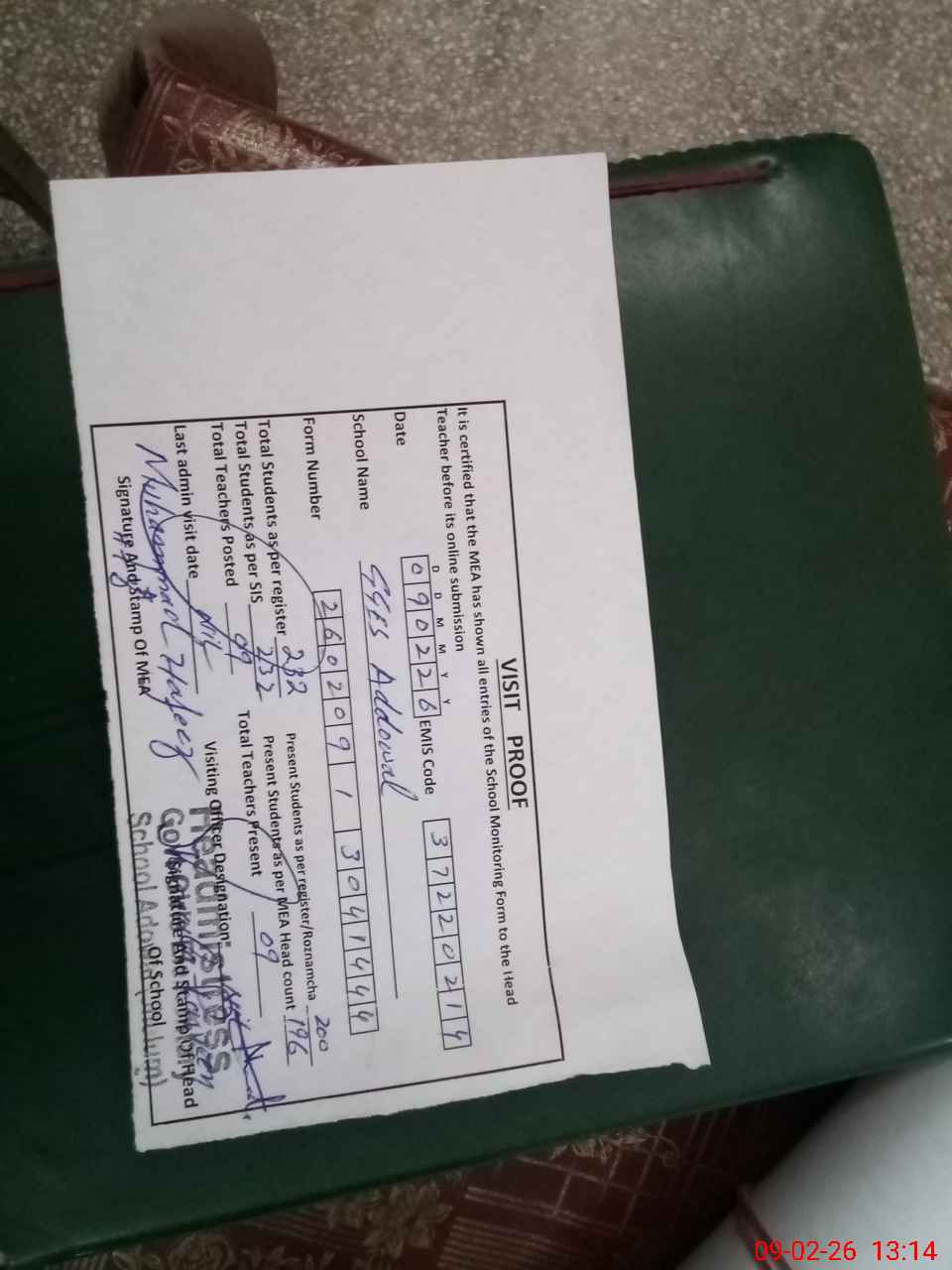 | Attendance Register | Head Teacher | MEA with School | Visit Proof |
