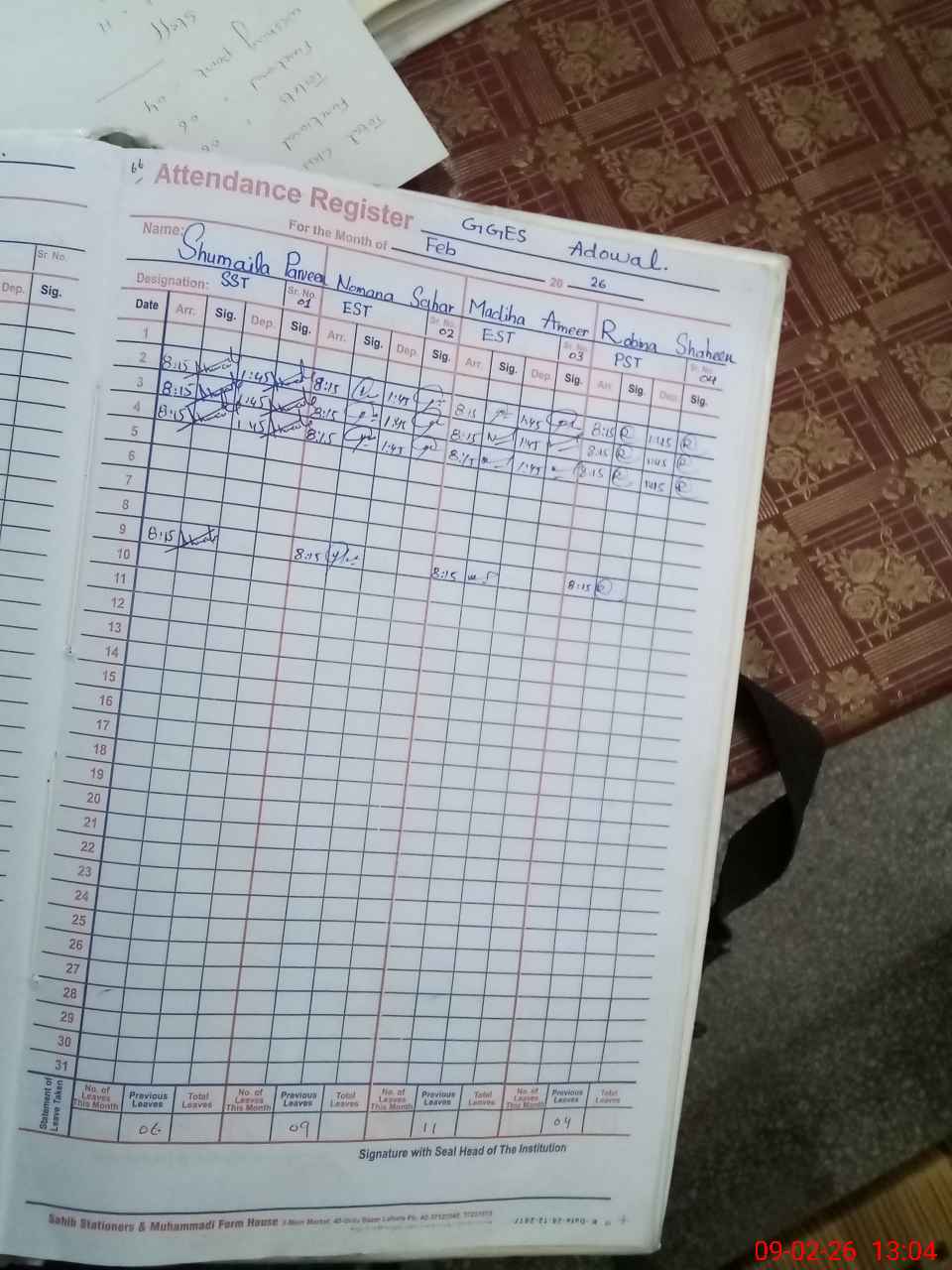 | CNIC | Full Name | Designation | R/C | Absence During Last Calender Month |