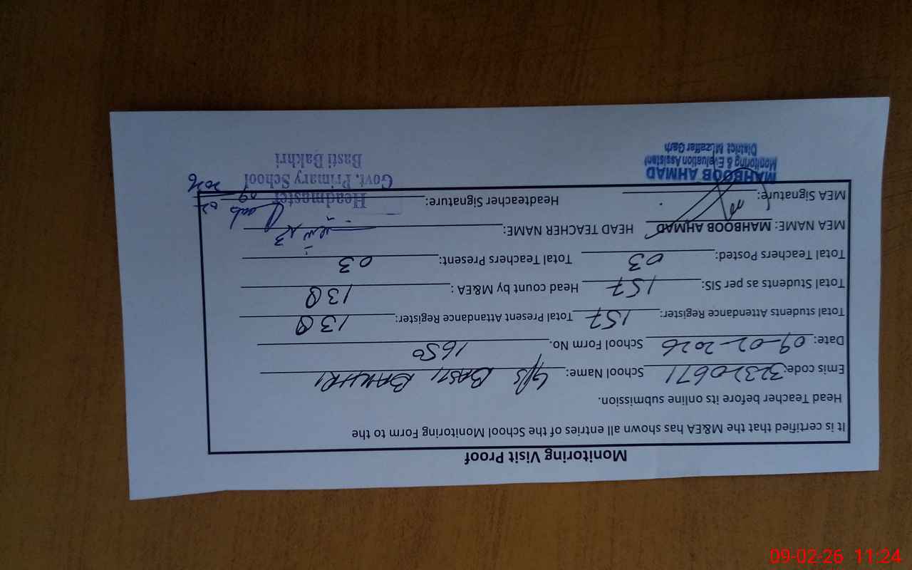 | Attendance Register | Head Teacher | MEA with School | Visit Proof |