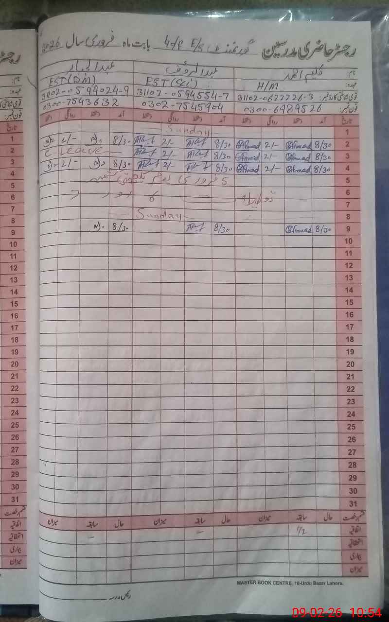 | CNIC | Full Name | Designation | R/C | Absence During Last Calender Month |