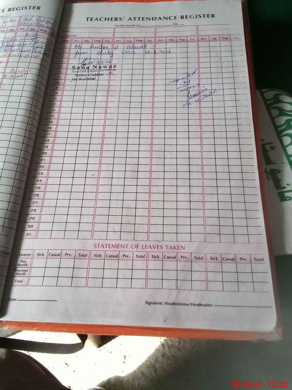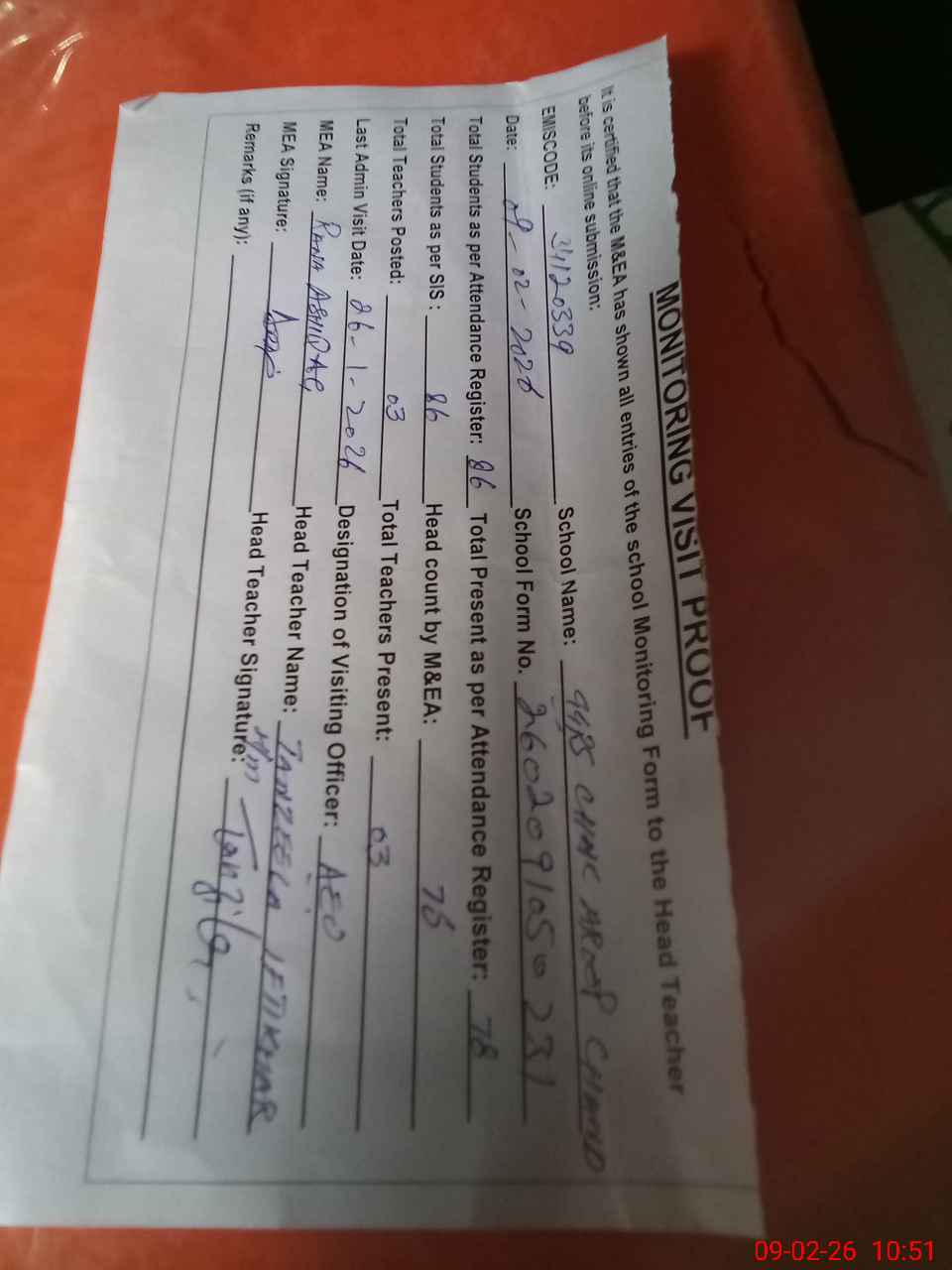 | Attendance Register | Head Teacher | MEA with School | Visit Proof |