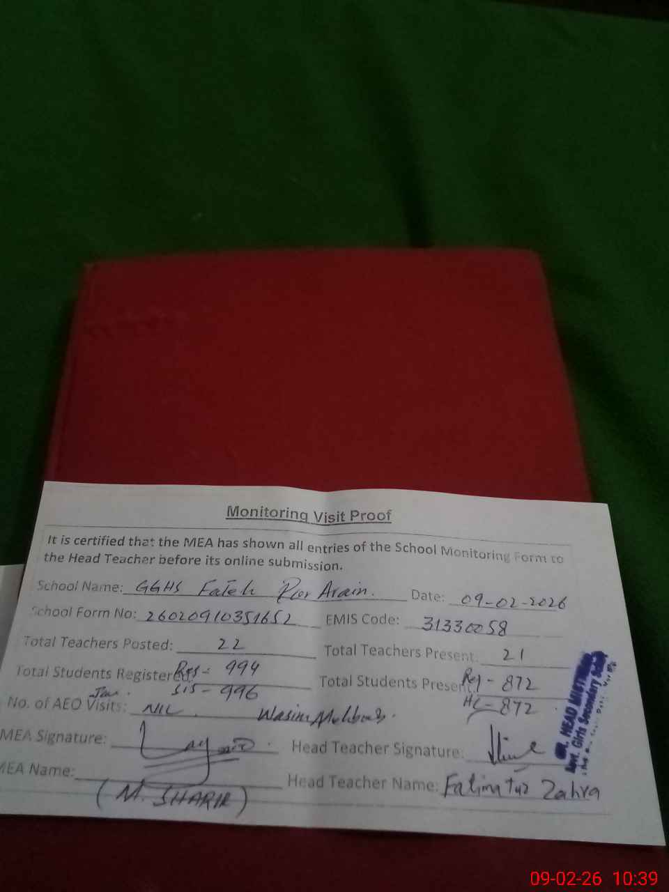 | EMIS Code: 31330058 | Name of School: GGHS FATEH PUR ARAIN | |||