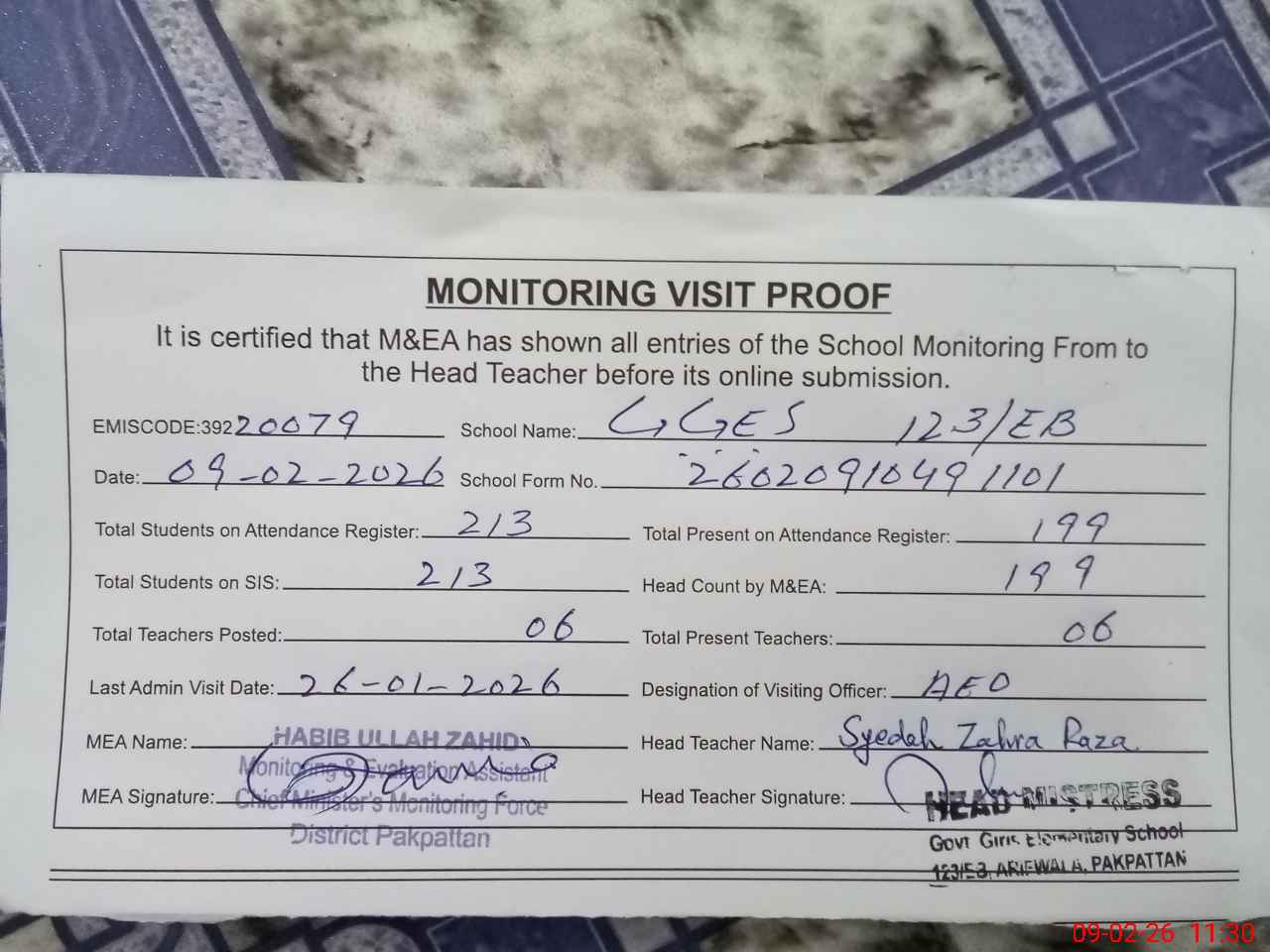 | Attendance Register | Head Teacher | MEA with School | Visit Proof |