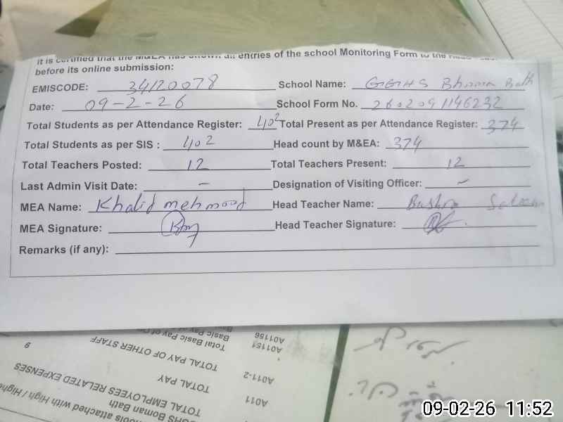 | EMIS Code: 34120078 | Name of School: GGHS BHOMAN BATH | |||