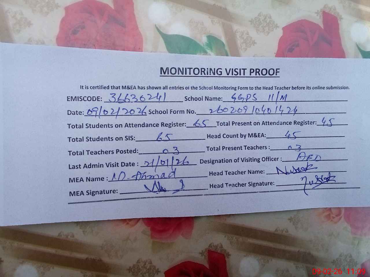 | Attendance Register | Head Teacher | MEA with School | Visit Proof |