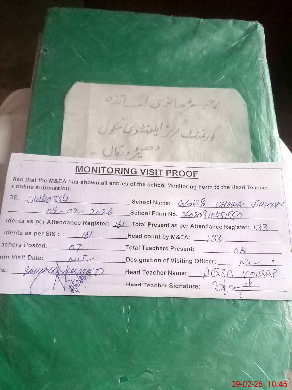 | Attendance Register | Head Teacher | MEA with School | Visit Proof |
