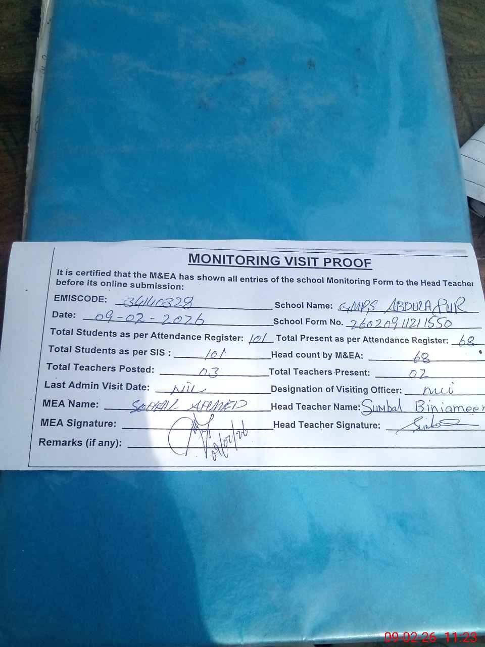 | Attendance Register | Head Teacher | MEA with School | Visit Proof |