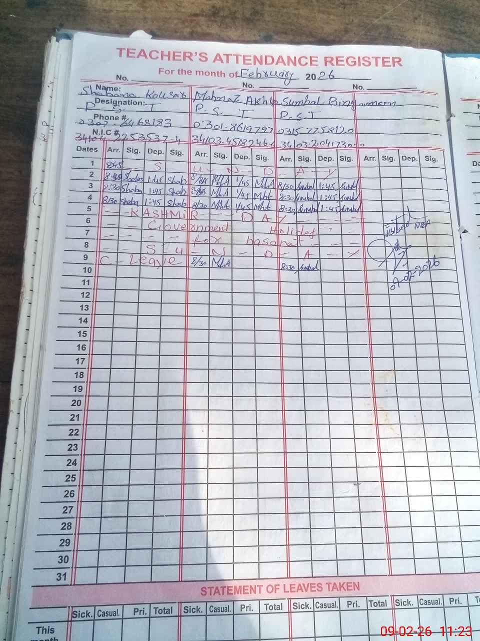| Name: SH**** KO**** Designation: (School Headmaster's/Headmistress's) PST Phone/Cell Number: 03**** |