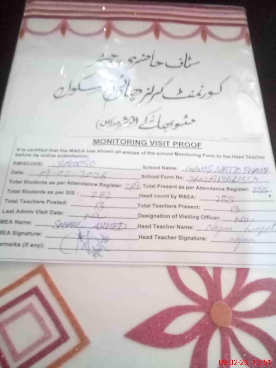 | Certified that this School was Inspected by the Undersigned MEA/DMO Today and the Information Stated Above is as Per Record. | |||||