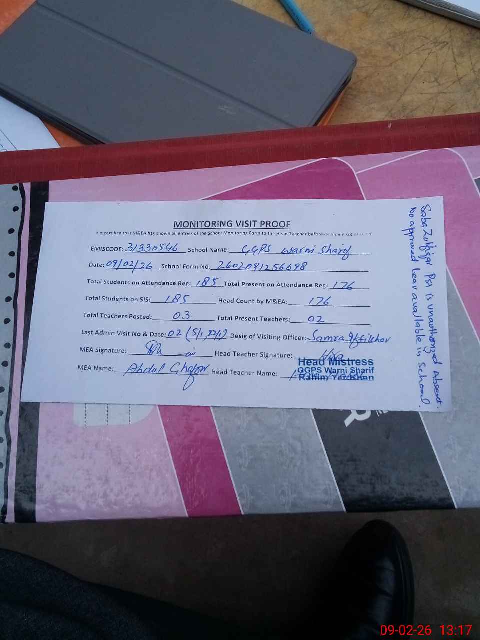 | EMIS Code: 31330546 | Name of School: GGPS WARNI SHARIF | |||