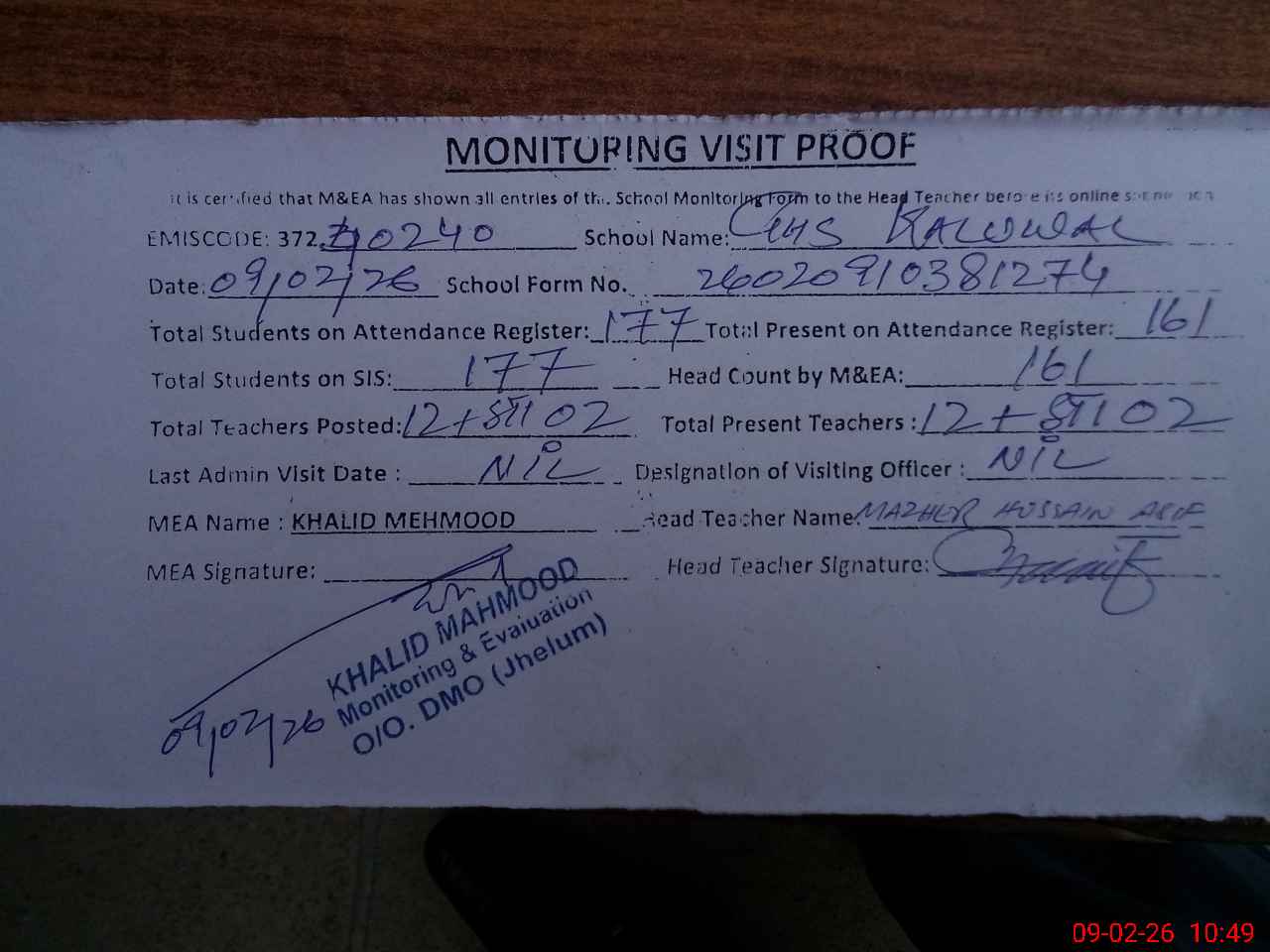 | Certified that this School was Inspected by the Undersigned MEA/DMO Today and the Information Stated Above is as Per Record. | |||||
