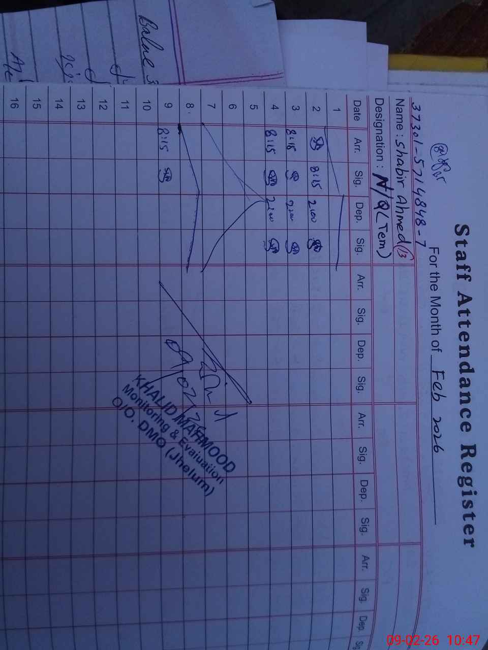 | CNIC | Full Name | Designation | R/C | Absence during last cal. month |