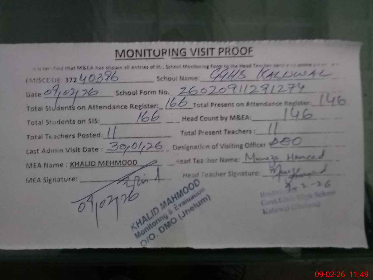 | Certified that this School was Inspected by the Undersigned MEA/DMO Today and the Information Stated Above is as Per Record. | |||||