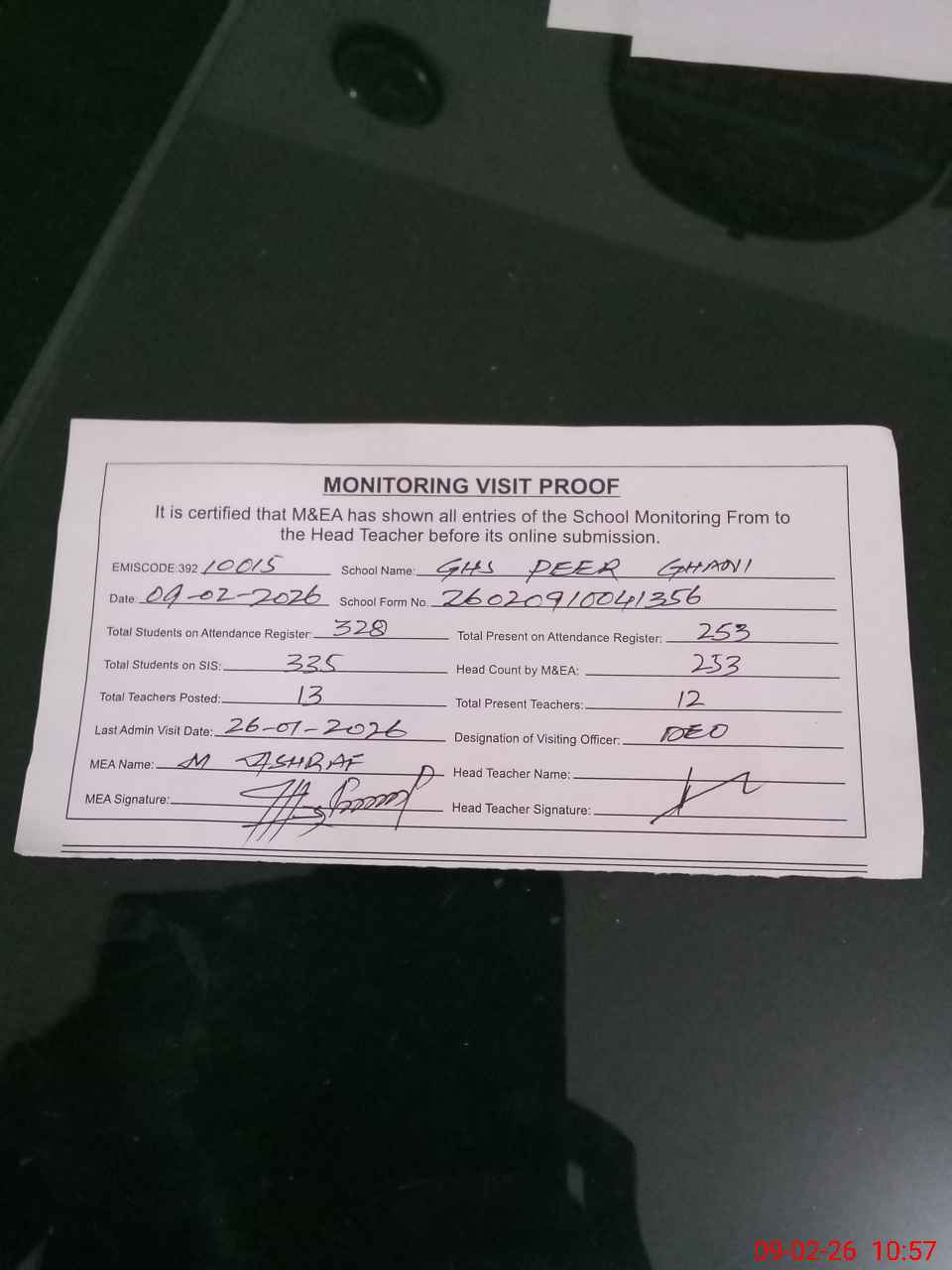 | Attendance Register | Head Teacher | MEA with School | Visit Proof |
