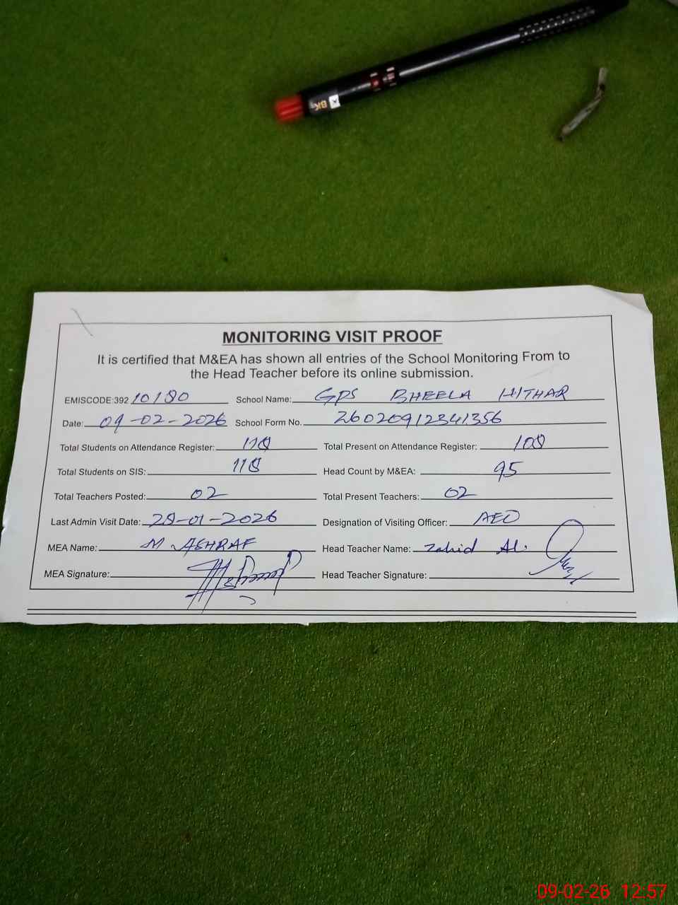 | Attendance Register | Head Teacher | MEA with School | Visit Proof |