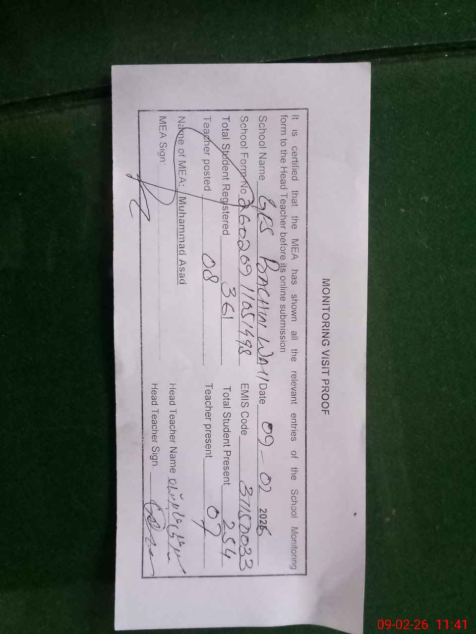 | Attendance Register | Head Teacher | MEA with School | Visit Proof |
