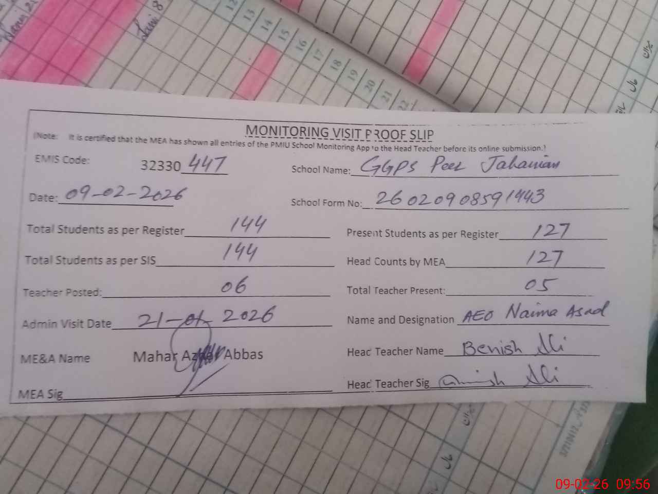 | Attendance Register | Head Teacher | MEA with School | Visit Proof |