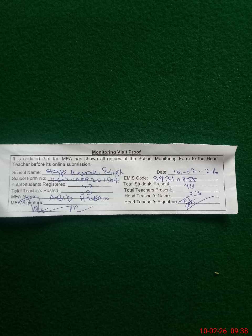 | Monitoring Date: 10-02-2026 | Start Time: 10-02-2026 09:20 AM | End Time: 10-02-2026 09:38 AM | Name of MEA: AB**** HU**** | |