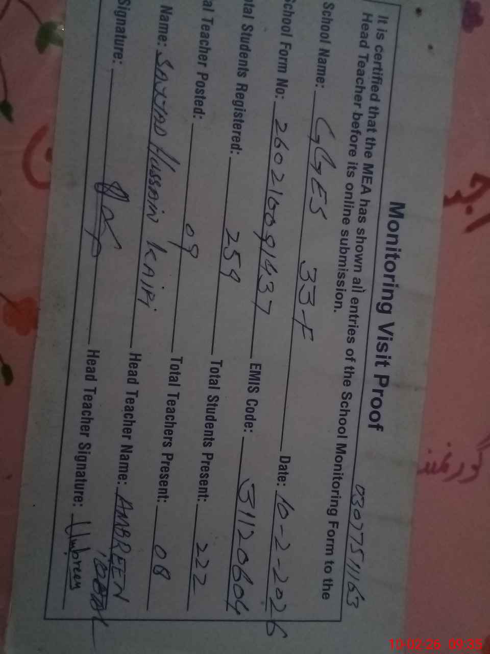 | Certified that this School was Inspected by the Undersigned MEA/DMO Today and the Information Stated Above is as Per Record. | |||||
