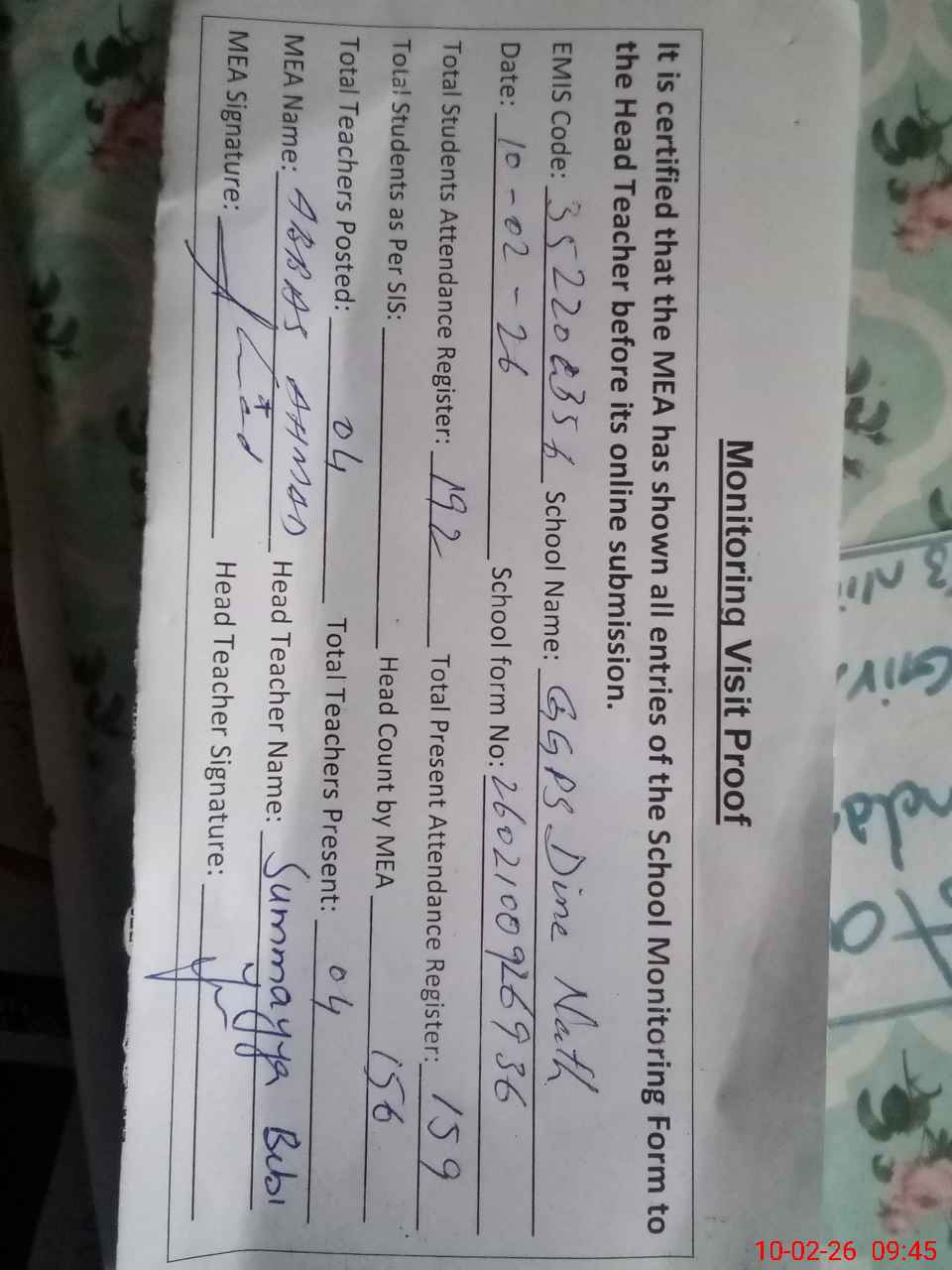 | EMIS Code: 35220356 | Name of School: GGPS DINA NATH MULTAN ROAD | |||