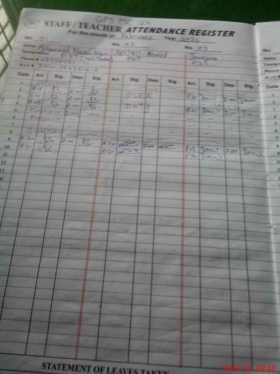 | CNIC | Full Name | Designation | R/C | Absence During Last Calender Month |