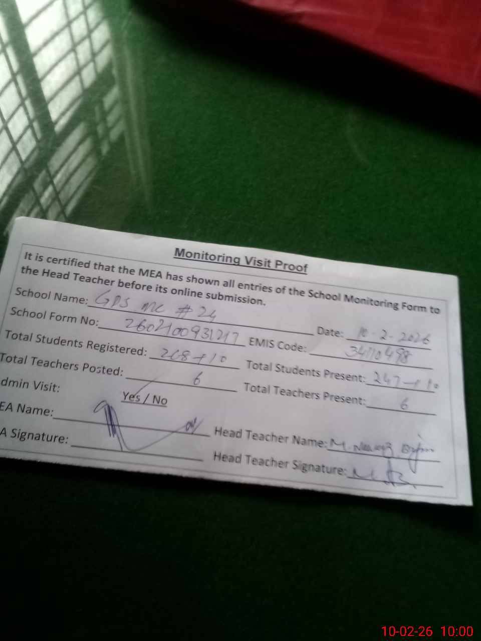 | Attendance Register | Head Teacher | MEA with School | Visit Proof |