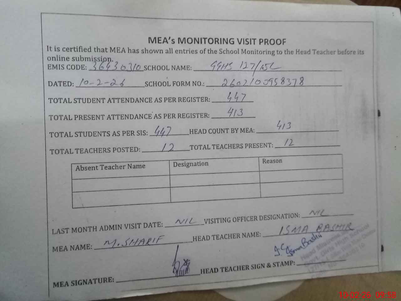 | Attendance Register | Head Teacher | MEA with School | Visit Proof |