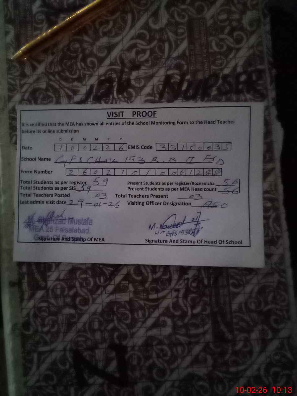 | Certified that this School was Inspected by the Undersigned MEA/DMO Today and the Information Stated Above is as Per Record. | |||||