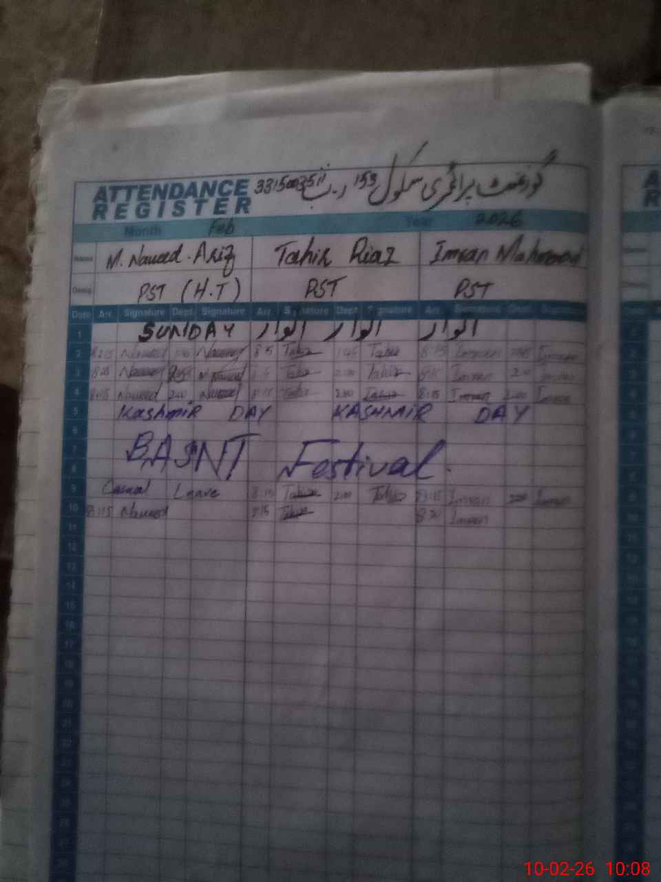 | CNIC | Full Name | Designation | R/C | Absence During Last Calender Month |