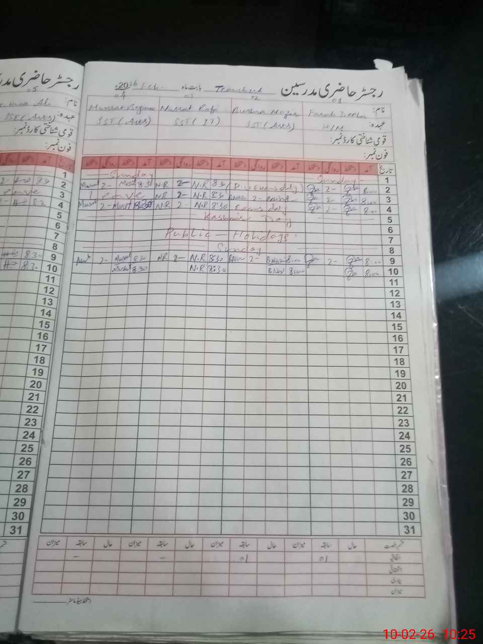 | Total no. of Classrooms: 31 No. of Classrooms Used for Teaching: 28 No. of Classrooms Storing Old Furniture, FTBs, etc: 0Comments if Any: Teacher Iqra khawja est absent since 12 September 2025 Teacher Chanda Asma expired on 24 December 2024 showing on teachers list Census data is not uploaded yet due to some teachers data verification issues Cleanliness is not satisfactory as school hired p |