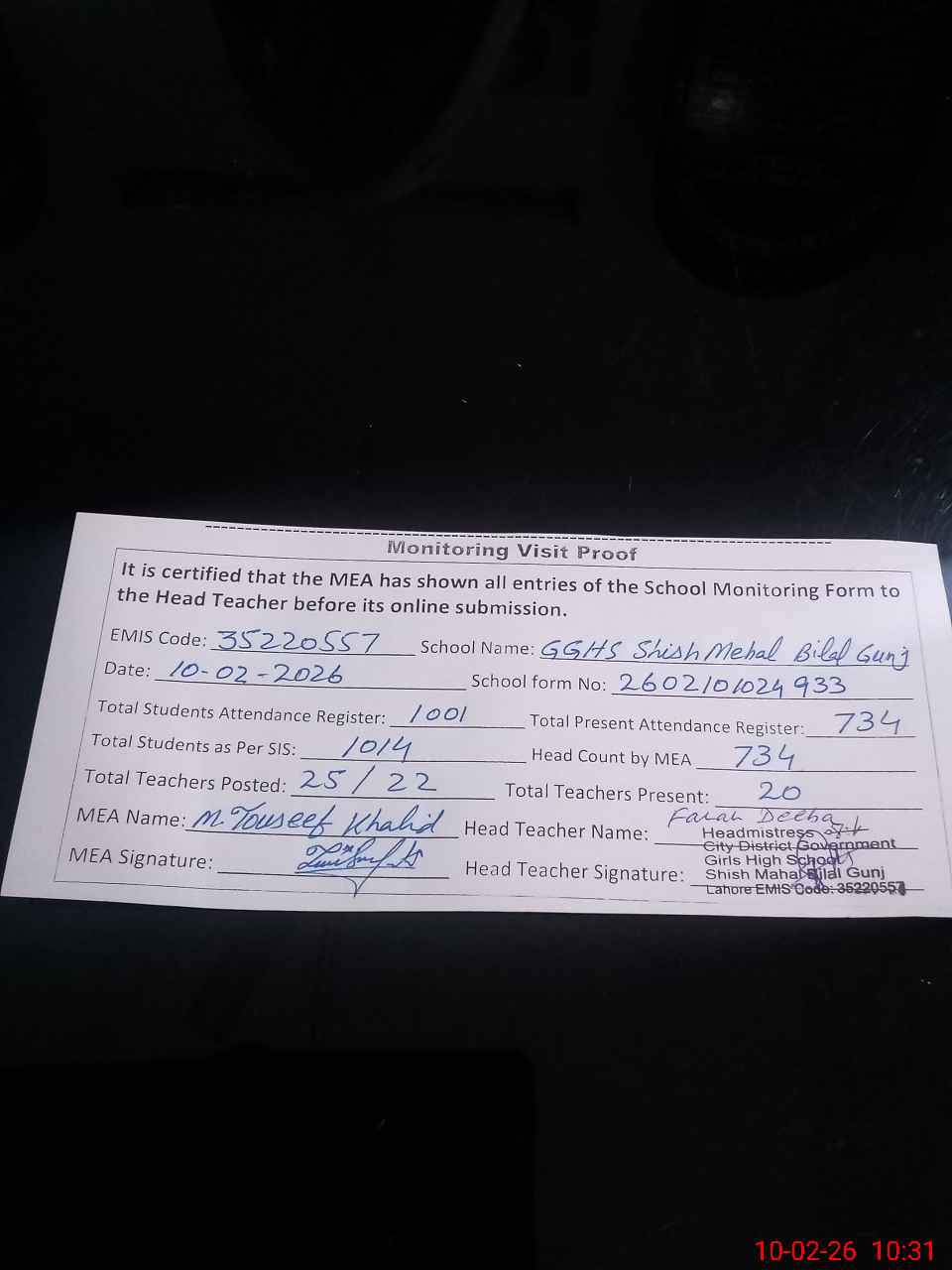 | EMIS Code: 35220557 | Name of School: GGHS SHISH MEHAL BILAL GUNJ (EX-MCL) | |||