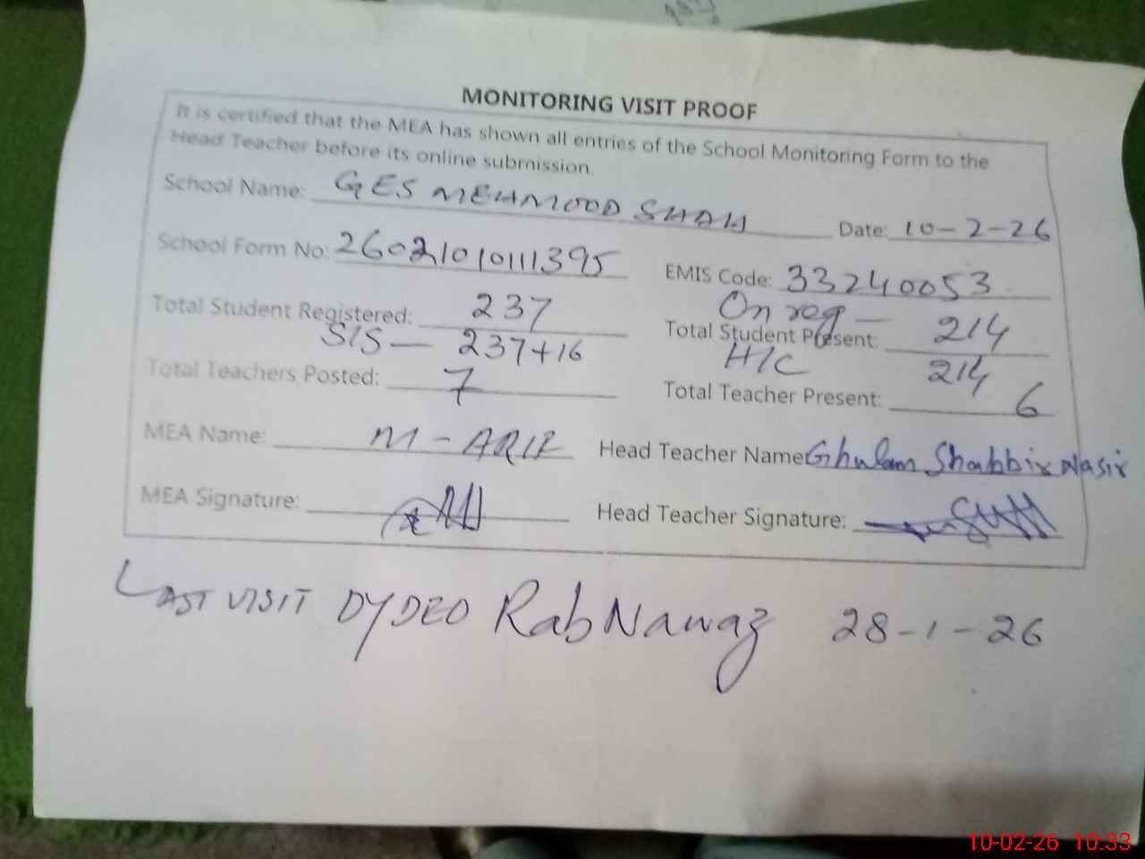 | EMIS Code: 33240053 | Name of School: GES MAHMOOD SHAH | |||