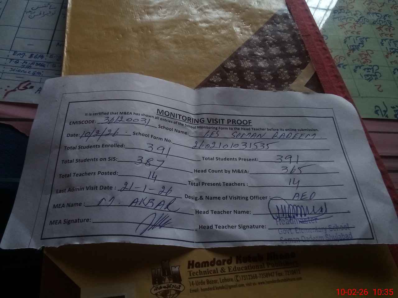 | Attendance Register | Head Teacher | MEA with School | Visit Proof |