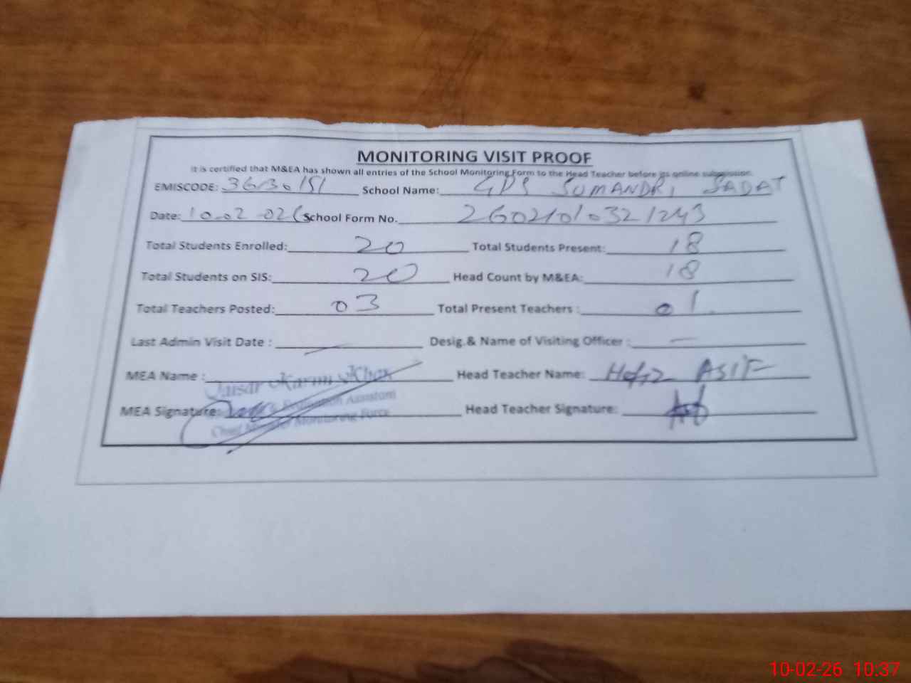 | Attendance Register | Head Teacher | MEA with School | Visit Proof |
