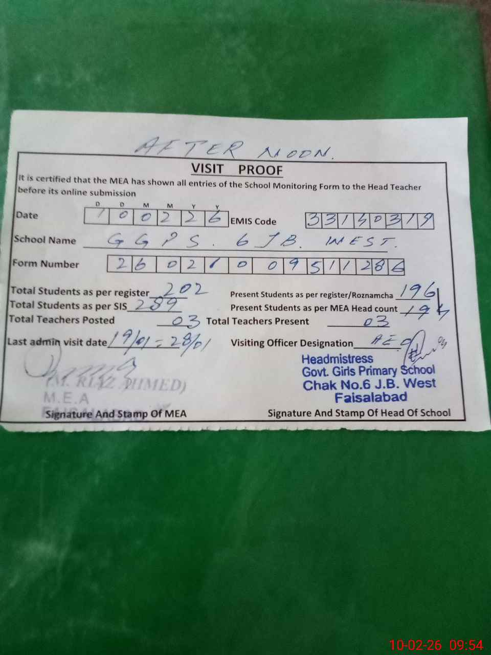 | Attendance Register | Head Teacher | MEA with School | Visit Proof |