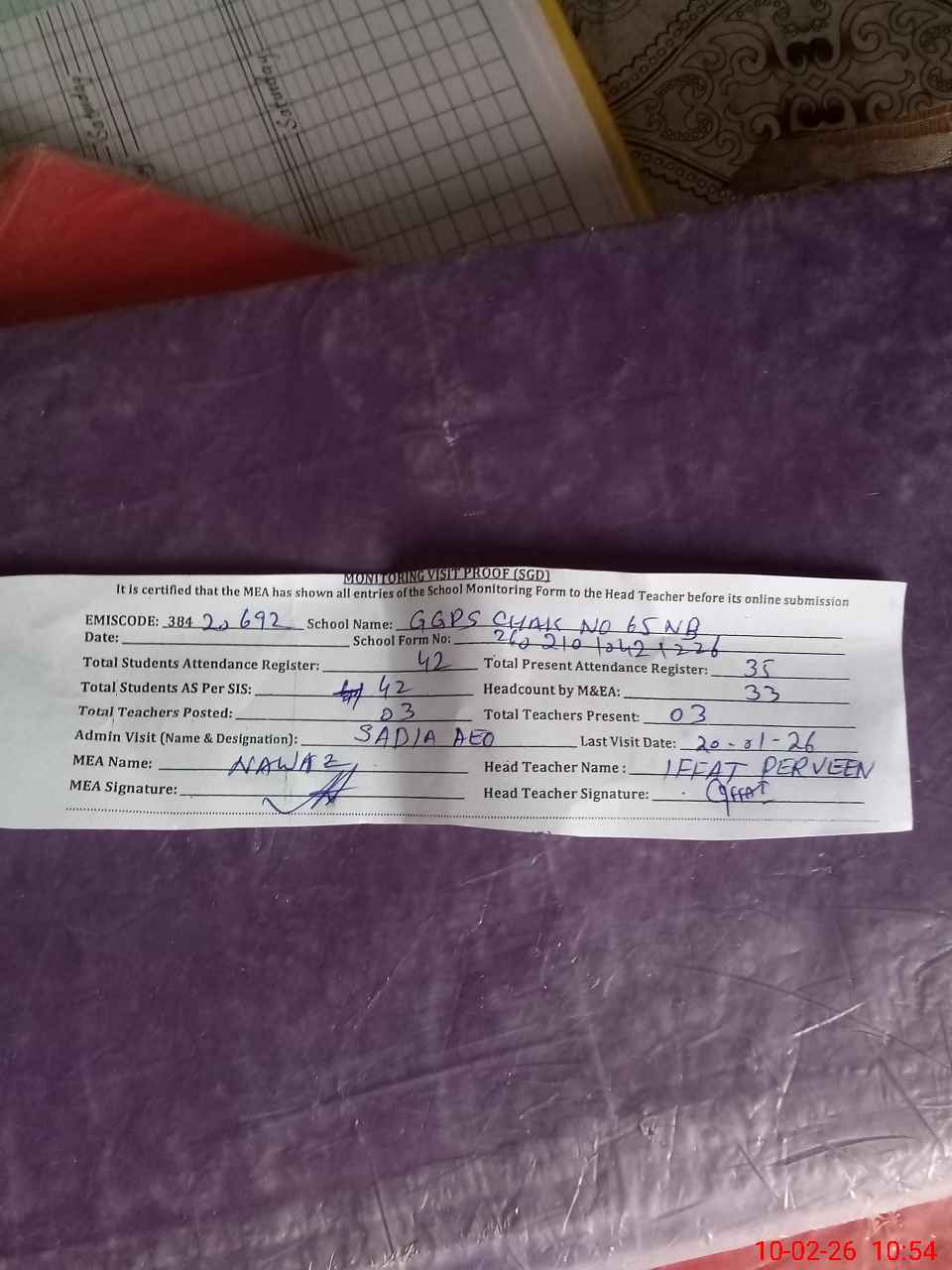 | Attendance Register | Head Teacher | MEA with School | Visit Proof |