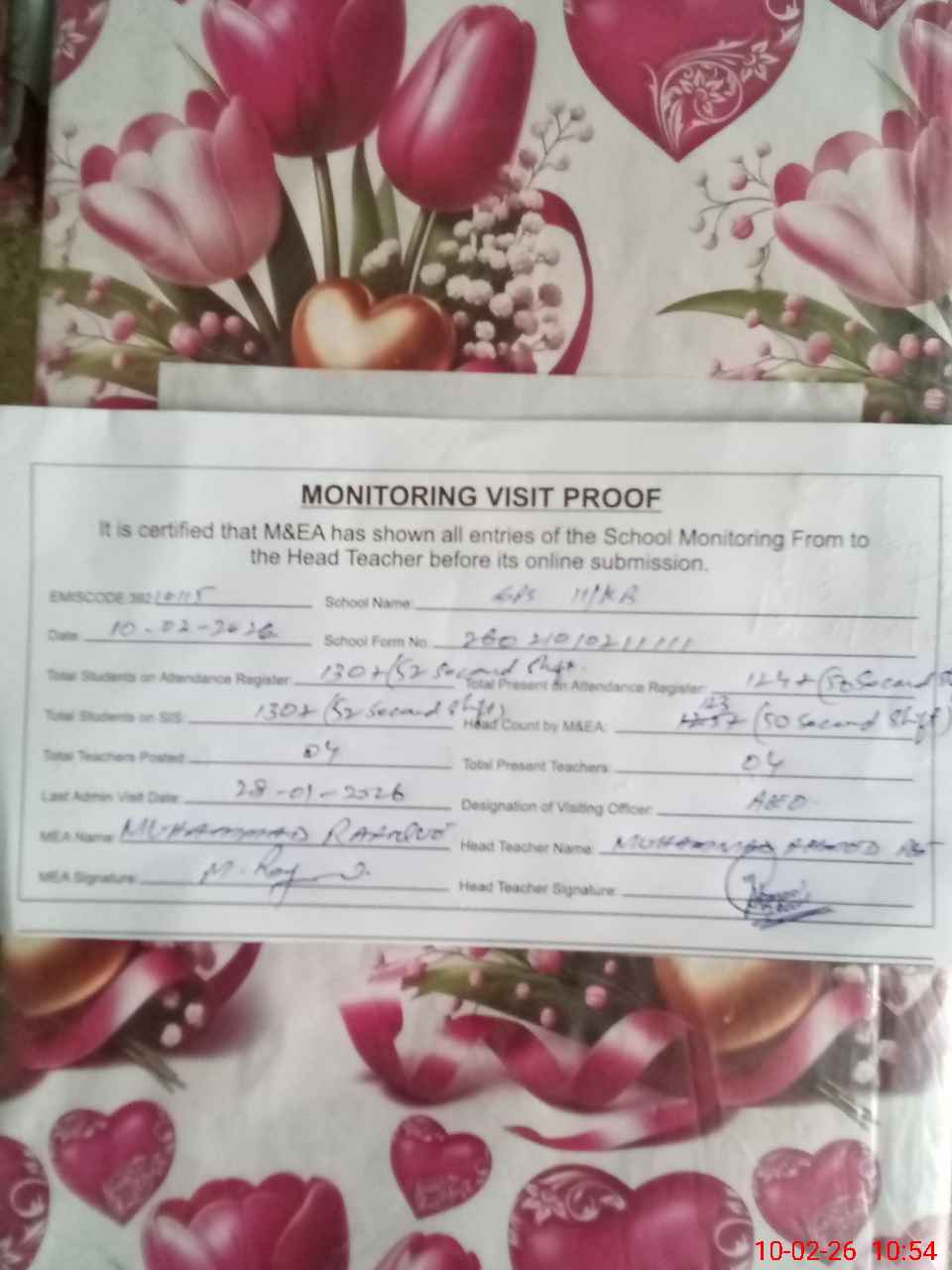 | Attendance Register | Head Teacher | MEA with School | Visit Proof |