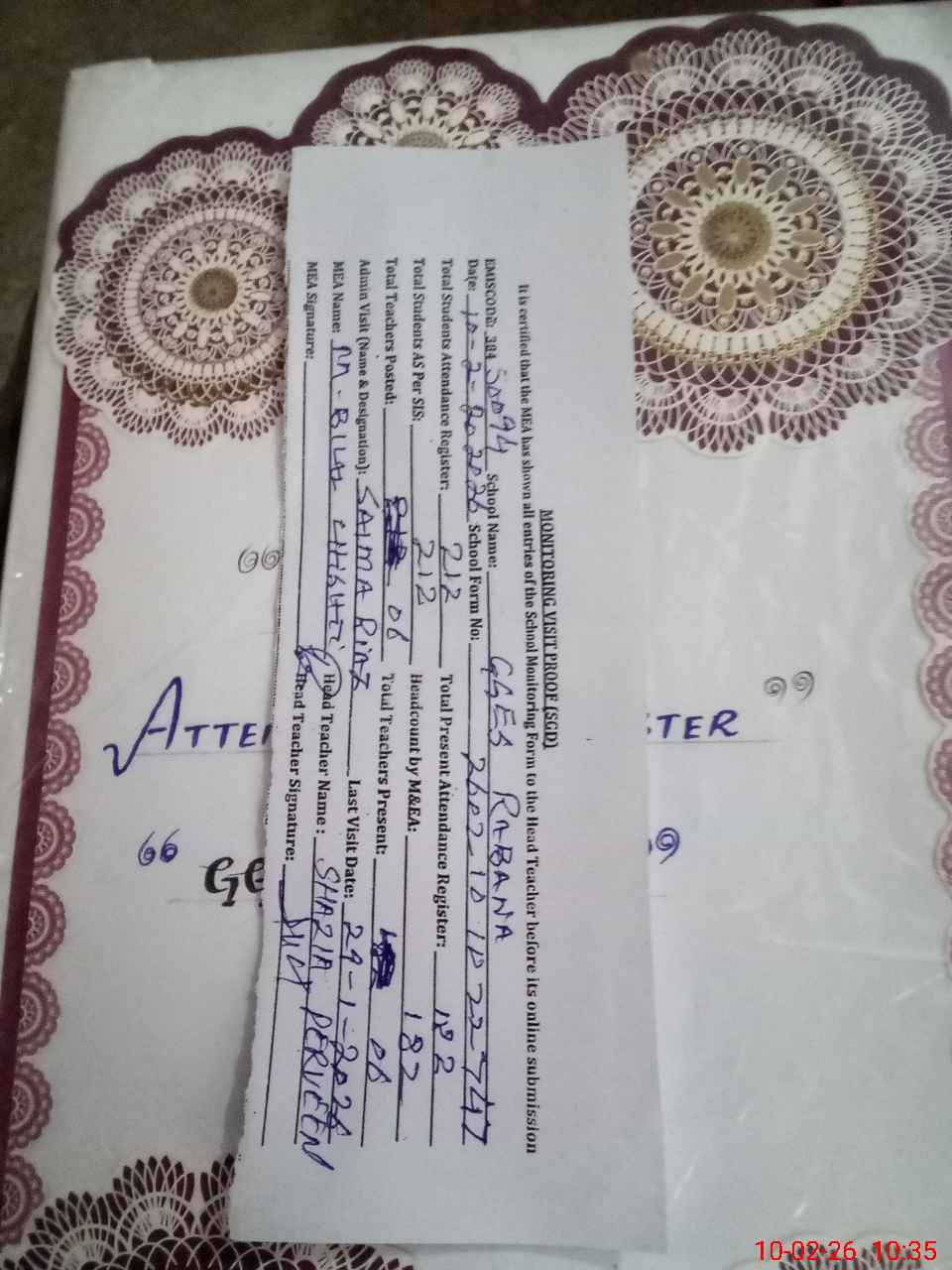 | Attendance Register | Head Teacher | MEA with School | Visit Proof |