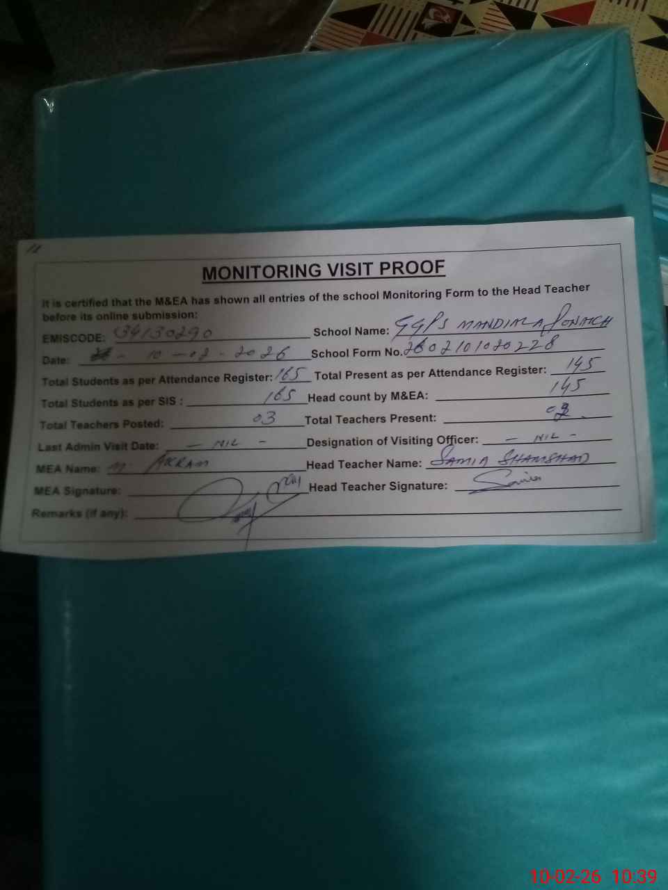 | Attendance Register | Head Teacher | MEA with School | Visit Proof |