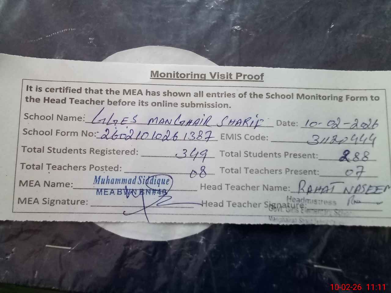 | Certified that this School was Inspected by the Undersigned MEA/DMO Today and the Information Stated Above is as Per Record. | |||||