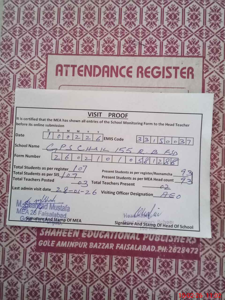 | Attendance Register | Head Teacher | MEA with School | Visit Proof |