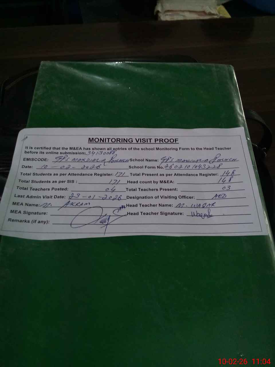 | Attendance Register | Head Teacher | MEA with School | Visit Proof |