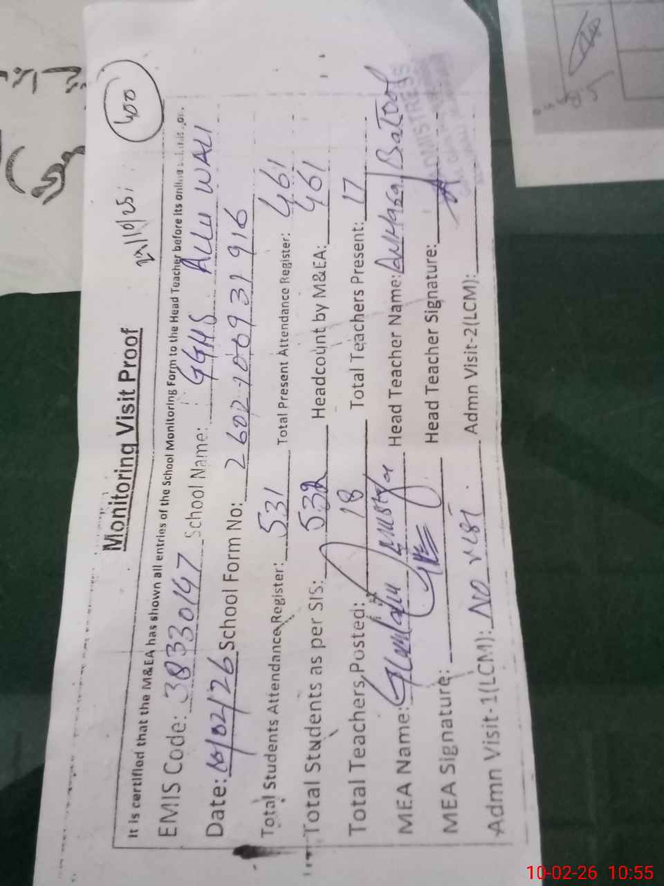 | Attendance Register | Head Teacher | MEA with School | Visit Proof |